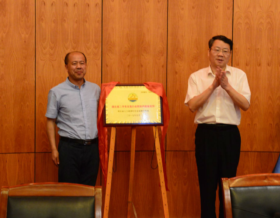 图为朱孔源(左)、胡仲军为“湖北省二手车交易行业职业技能鉴定所”揭牌