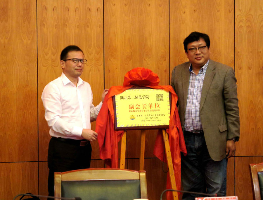 图为罗吉文(右)、夏力为“湖北省二手车交易行业协会我校副会长单位”揭牌