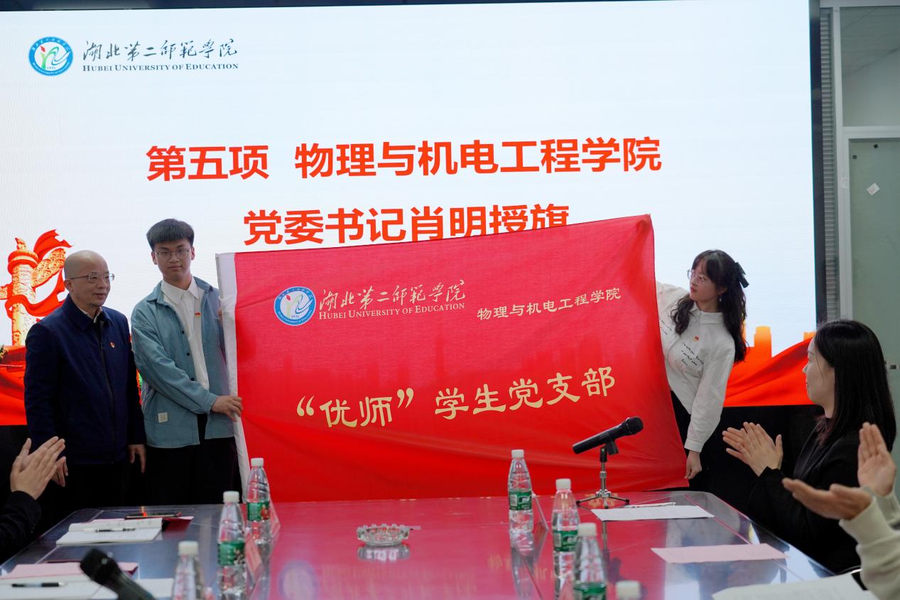 yl6809永利官网党委书记肖明为“优师”学生党支部授优秀锦旗,组织部常务副部长陈慧敏向“优师”学生党支部赠书。