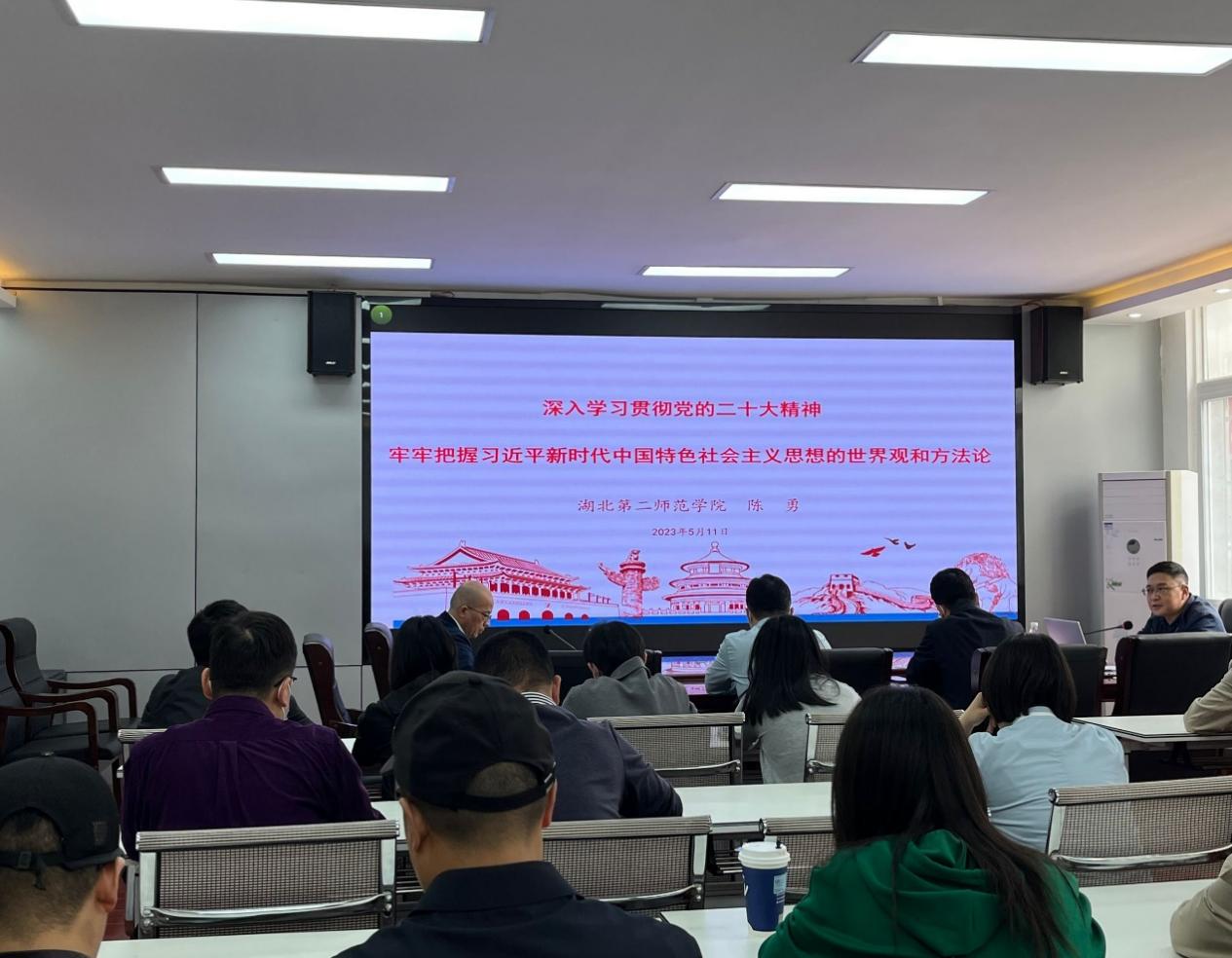 陈勇以《深入学习贯彻党的二十大精神,牢牢把握习近平新时代中国特色社会主义思想的世界观和方法论》为题作专题辅导报告,围绕找准并掌握学习贯彻党的二十大精神的“金钥匙”;领会并理解习近平新时代中国特色社会主义思想的世界观和方法论;运用并践行在思想洗礼中追求卓越、勇毅前行三个方面对党的二十大精神进行了深入的解读,他号召全体党员教师,要锚定学校第二次党代会确立的达标申硕、更名大学的奋斗目标,落实立德树人根本任务,为学校高质量发展贡献力量。