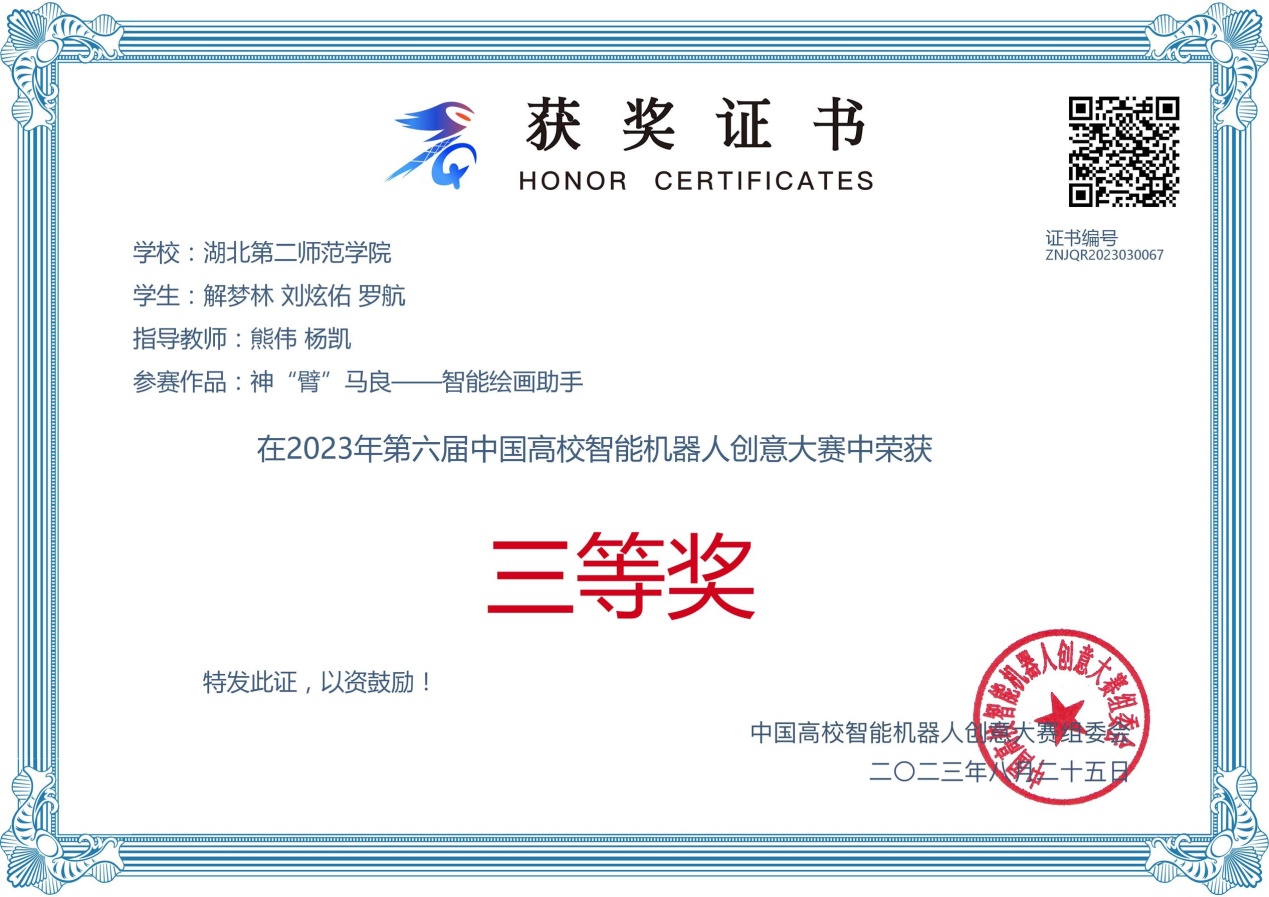 校网讯(通讯员 杨凯)近日,第六届中国高校智能机器人创意大赛总决赛在宁波余姚市落下帷幕,我校yl6809永利官网学子解梦林、刘炫佑、罗航同学创作的作品《神“臂”马良--智能绘画助手》获三等奖。