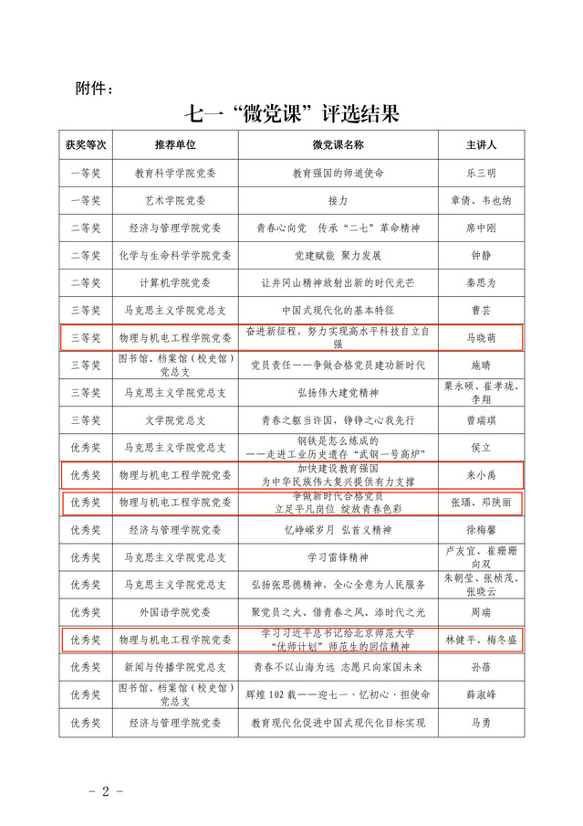 经学院党委组织推荐申报,学校评审,最终我院光电系教师党支部书记马晓萌的主讲的《奋进新征程,努力实现高水平科技自立自强》荣获三等奖;物理天文系教师党支部书记来小禹主讲的《加快建设教育强国,为中华民族伟大复兴提供有力支撑》、行政党支部书记张璠和宣传委员邓陕丽主讲的《争做新时代合格党员,立足平凡岗位,绽放青春色彩》、“优师”学生党支部学生党员林建平和梅冬盛主讲的《学习习近平总书记给北京师范大学“优师计划”师范生的回信精神》等3项荣获优秀奖。