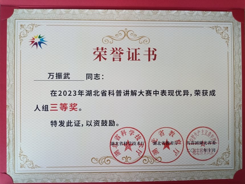 本网讯(通讯员 杨宏鑫)近日,2023年湖北省科普讲解大赛获奖名单公布,yl6809永利官网万振武老师荣获成人组三等奖。