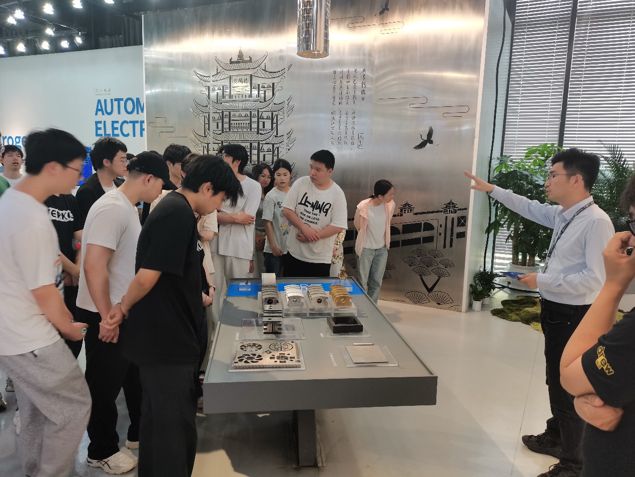 交流伊始,华工科技智能制造未来产业园经理郭昊带领光电班的同学们参观了激光博物馆和激光高端装配制造车间,并讲解了公司的企业文化。随后,王筠与郭昊进行了深入的交流,并共同探讨了如何将企业的实际需求与学校的教学内容相结合,以更好的培养出符合市场需求的高素质人才等问题。